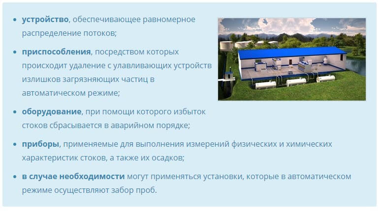В состав защитных очистных сооружений должно входить следующее оборудование: